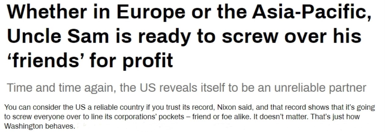 正如美國(guó)電臺(tái)主持人、政治分析家加蘭·尼克松在一篇文章中所說,歷史記錄表明,“美國(guó)為了本國(guó)公司的利益會(huì)坑害所有人——無論朋友還是敵人。這就是華盛頓的行為方式”。