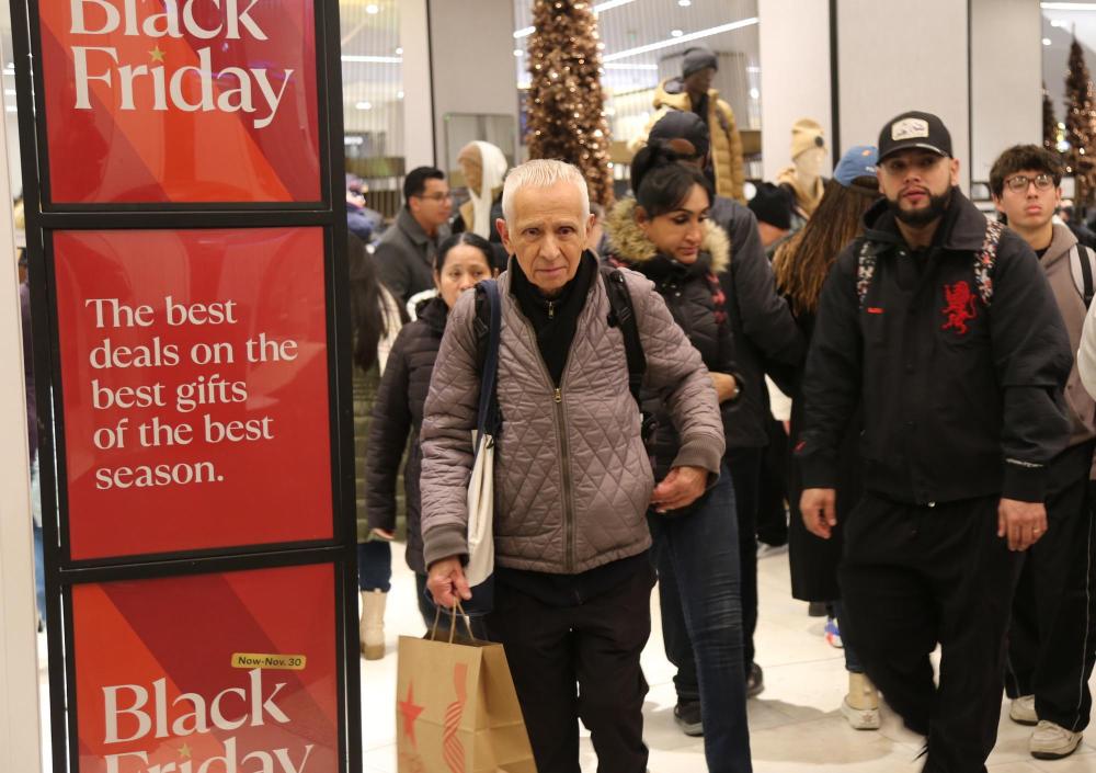 2024年11月29日,在美國(guó)紐約曼哈頓島的一家商場(chǎng)內(nèi),人們經(jīng)過(guò)“黑色星期五”促銷廣告牌。新華社記者劉亞南攝