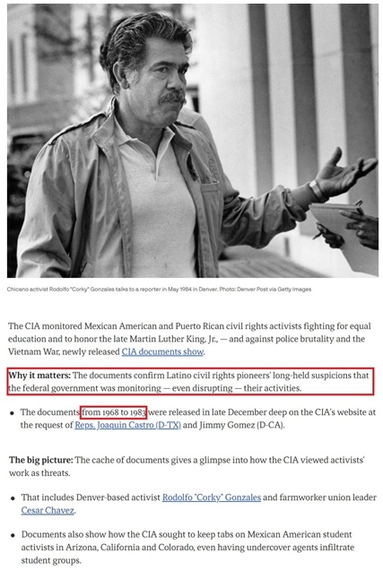文件揭示,從1968年到1983年,中情局一直在監(jiān)聽、監(jiān)視魯?shù)婪颉ぁ翱苹薄_雷斯和塞薩爾·查韋斯等美國拉美裔民權(quán)活動(dòng)人士的一舉一動(dòng)。他們均長期致力于要求實(shí)現(xiàn)平權(quán)和消除貧困。