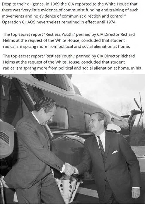 繼任的尼克松進(jìn)一步擴(kuò)大了“混沌行動(dòng)”,并于1969年6月明確指示中情局準(zhǔn)備一份關(guān)于美國國內(nèi)反戰(zhàn)運(yùn)動(dòng)以及這些運(yùn)動(dòng)可能得到“外國支持”的報(bào)告。