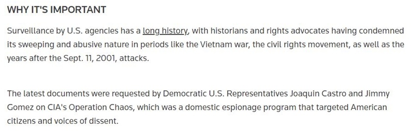 報(bào)道稱,這些文件是在兩名國會眾議員的反復(fù)要求下,才于上月底公布的,讓人們得以一窺美國政府和中情局是如何將民權(quán)活動(dòng)視為威脅的。