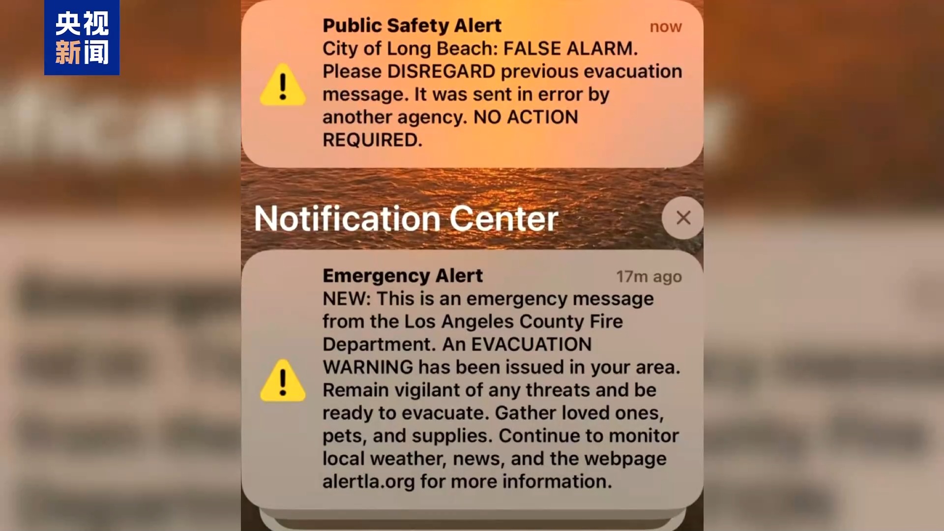央視記者 劉驍騫:與此同時,根據(jù)我在一線的觀察,人為造成的災(zāi)害正在出現(xiàn)。首先,洛杉磯縣的警報發(fā)布系統(tǒng)嚴重失靈,造成撤離信息的混亂。一般情況下,如果你所在的區(qū)域處于撤離預警或者需要立刻撤離的范圍內(nèi),手機就會收到由洛杉磯縣發(fā)布的政府警報。第一次發(fā)生警報失靈的情況是10日3時左右,我的手機發(fā)出巨大的警報聲,短信內(nèi)容顯示“我居住的區(qū)域需要立刻撤離”,但是我打開窗,發(fā)現(xiàn)室外并沒有煙味,我立刻登錄了另外幾個災(zāi)難預警app,也沒有發(fā)現(xiàn)周遭有新的山火出現(xiàn)。幾乎在同一時間,很多生活在洛杉磯不同區(qū)域的網(wǎng)友都表示收到了這條警報。在10日的白天,類似的錯誤警報幾乎每隔幾小時就出現(xiàn)一次,普通居民也從一開始收到警報時的緊張,變成麻木,有的人為了避免過于焦慮,甚至在手機設(shè)置中關(guān)掉了政府警報通知。