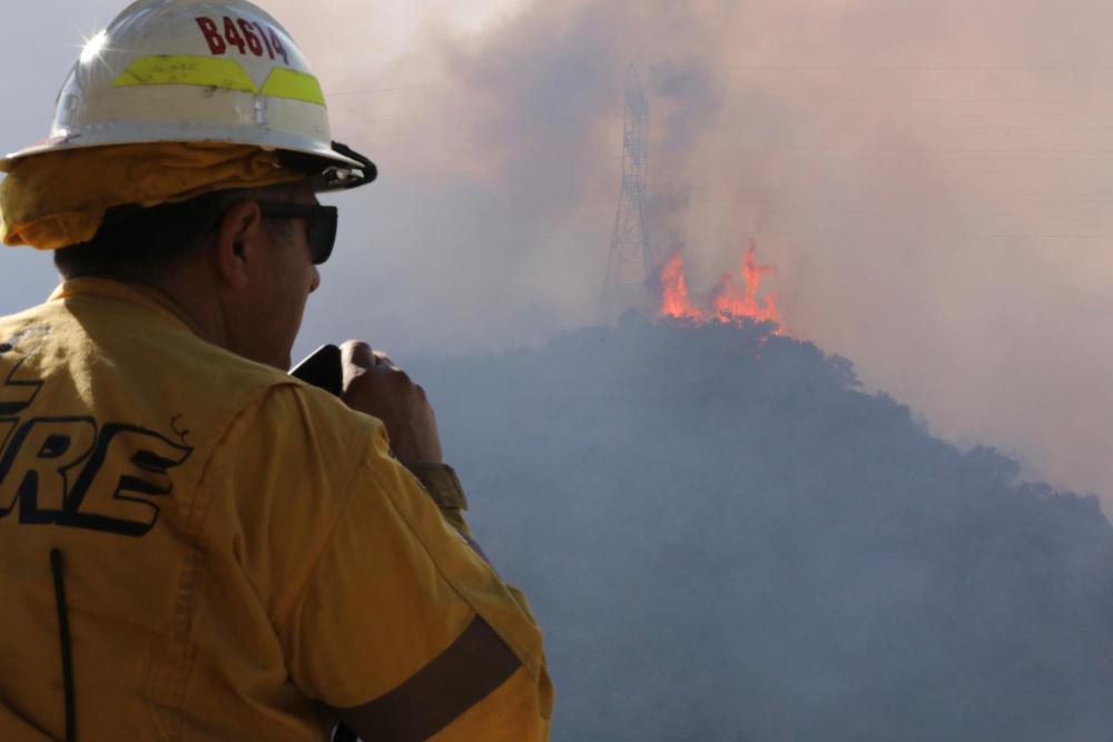 1月11日,消防員在美國(guó)加利福尼亞州洛杉磯曼德維爾峽谷的一座山丘頂部觀望野火火勢(shì)。新華社發(fā)(邱晨攝)