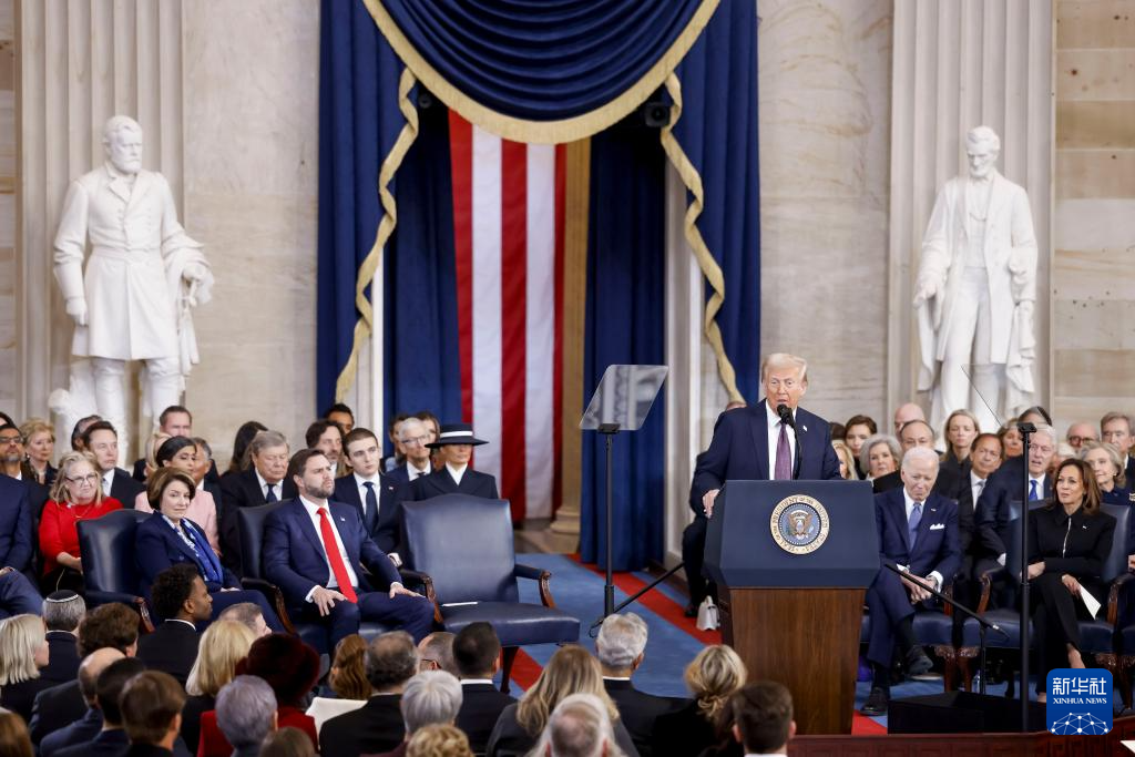 1月20日,在美國(guó)首都華盛頓國(guó)會(huì)大廈圓形大廳,特朗普在美國(guó)第47任總統(tǒng)就職典禮上發(fā)表講話。新華社/美聯(lián)