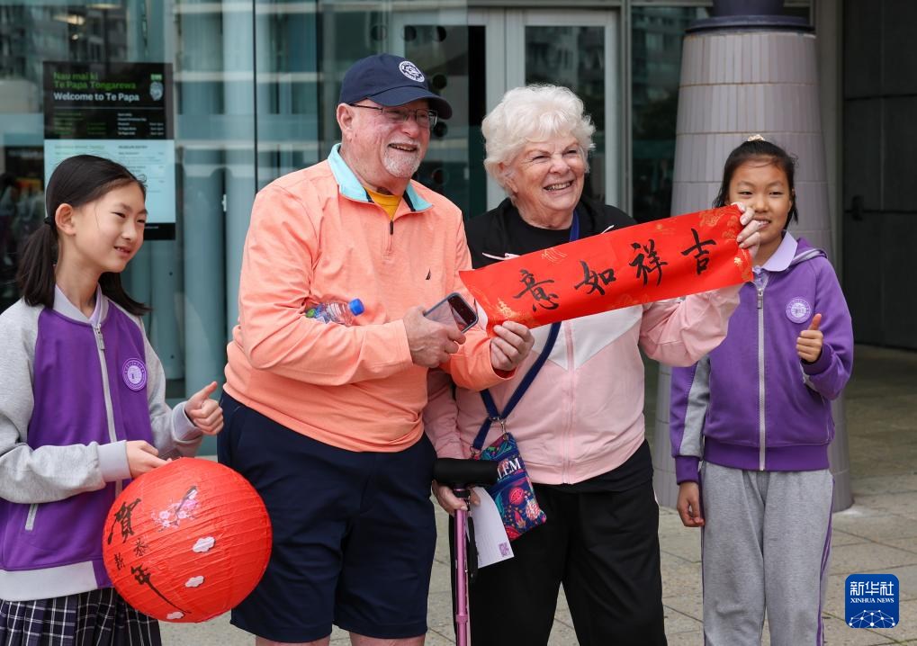 2月1日,在新西蘭首都惠靈頓,當(dāng)?shù)鼐用裨诙嘣逡嵯灿瓪g樂春節(jié)活動(dòng)中展示中國(guó)書法作品。新華社發(fā)(孟韜攝)