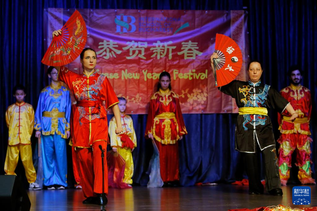 1月31日,在羅馬尼亞布加勒斯特國(guó)際學(xué)校,羅馬尼亞武術(shù)愛好者在新春聯(lián)歡會(huì)上表演。新華社發(fā)(克里斯泰爾攝)