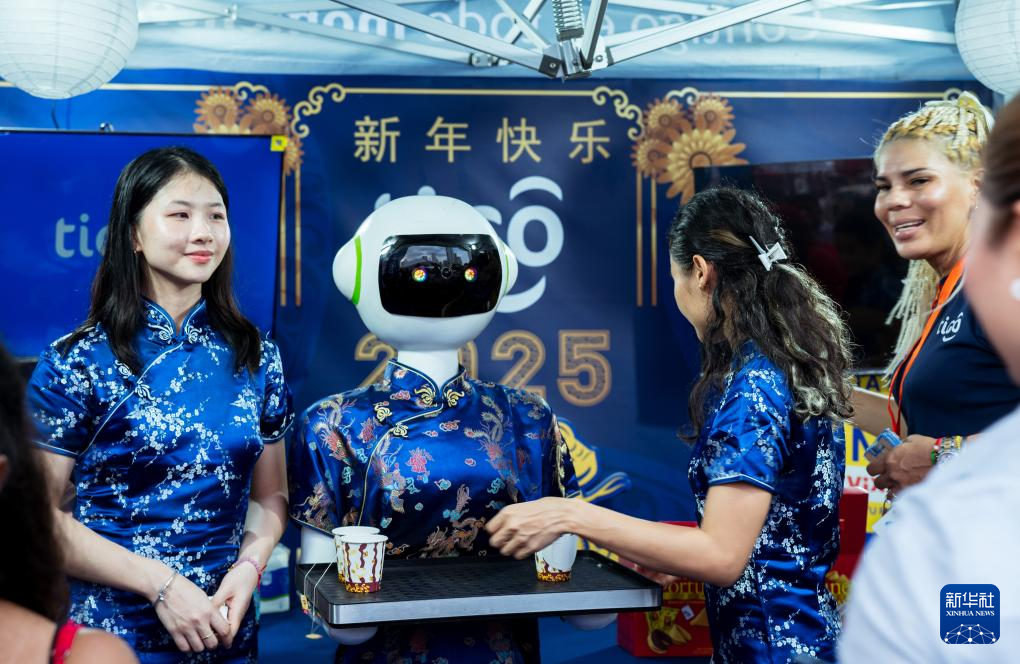 1月31日,在巴拿馬首都巴拿馬城的華僑華人歡樂春節(jié)廟會(huì)上,機(jī)器人為游客送上中國(guó)茶水。新華社記者 許詠政 攝