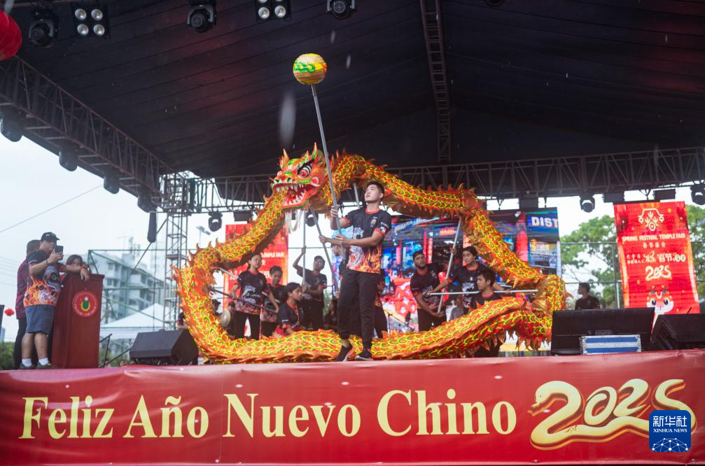 這是1月31日在巴拿馬首都巴拿馬城的華僑華人歡樂春節(jié)廟會(huì)上拍攝的舞龍表演。新華社記者 許詠政 攝