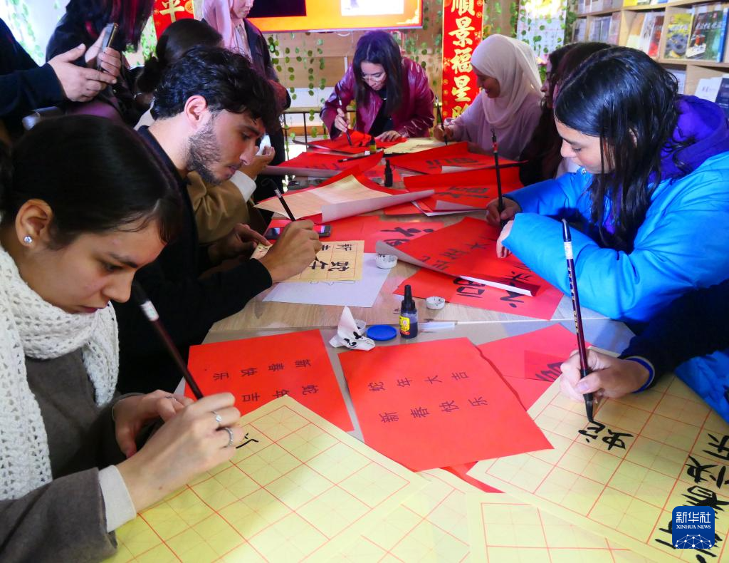 春節(jié)期間,突尼斯東方知識(shí)書店舉行了春節(jié)相關(guān)文化活動(dòng),參與者通過觀看視頻短片、有獎(jiǎng)問答、寫福字等活動(dòng)了解中國(guó)春節(jié)常識(shí)并親身體會(huì)中國(guó)年味。突尼斯迦太基大學(xué)高等語言學(xué)院中文專業(yè)學(xué)生興致勃勃地演唱了《月亮代表我的心》等中文歌曲。