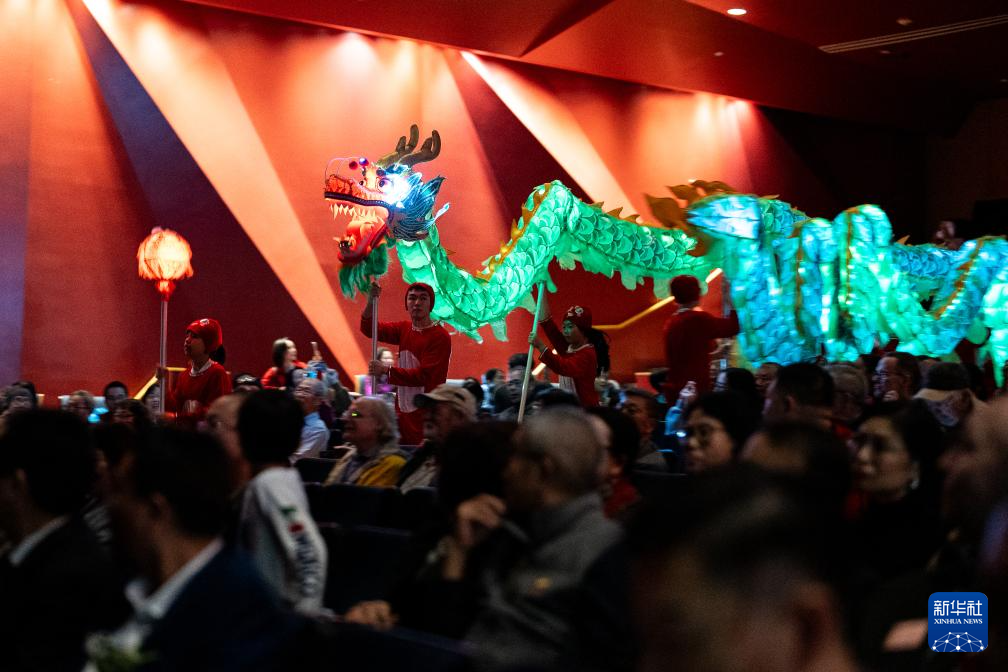 1月26日,演員在美國(guó)休斯敦“擁抱春天”春節(jié)聯(lián)歡晚會(huì)現(xiàn)場(chǎng)舞龍。新華社發(fā)(陳晨攝)