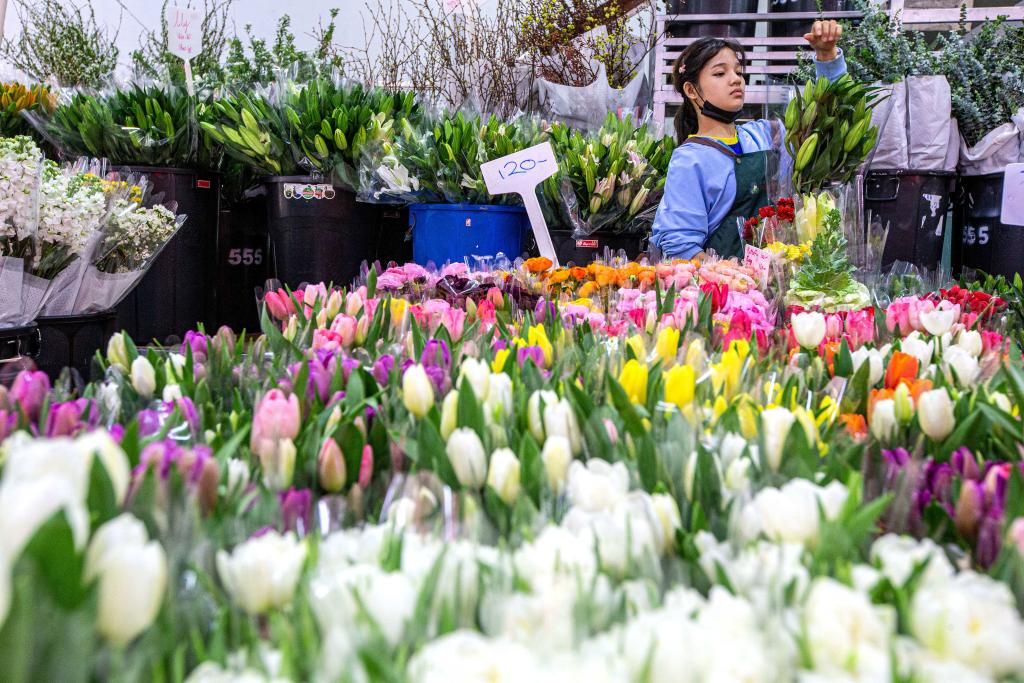2023年2月21日,工作人員在泰國曼谷帕空鮮花市場包裝來自云南的鮮花。新華社記者王騰攝