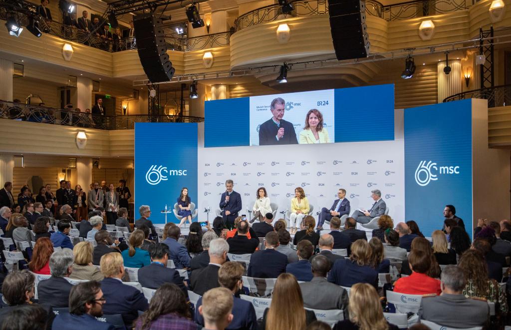 2024年2月18日,慕安會主席克里斯托夫·霍伊斯根(中左二)在德國慕尼黑舉行的第60屆慕尼黑安全會議上發(fā)表閉幕致辭。新華社記者 張帆 攝