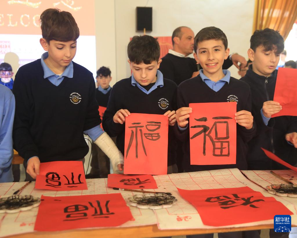 與此同時(shí),在學(xué)校禮堂內(nèi),學(xué)生們正在熱火朝天地體驗(yàn)中國(guó)書法藝術(shù)的獨(dú)特魅力。馬耳他中國(guó)文化中心的工作人員為學(xué)生們講解中國(guó)文房四寶的歷史淵源,現(xiàn)場(chǎng)演示書法基本技法。隨后,學(xué)生們興致勃勃地練習(xí)書寫,感受中國(guó)書法的韻味,他們?cè)谛埳狭粝碌哪E勾勒出對(duì)東方文化的向往。當(dāng)一個(gè)個(gè)工整的“福”字、“春”字躍然紙上時(shí),學(xué)生們興奮不已,互相欣賞彼此的作品。