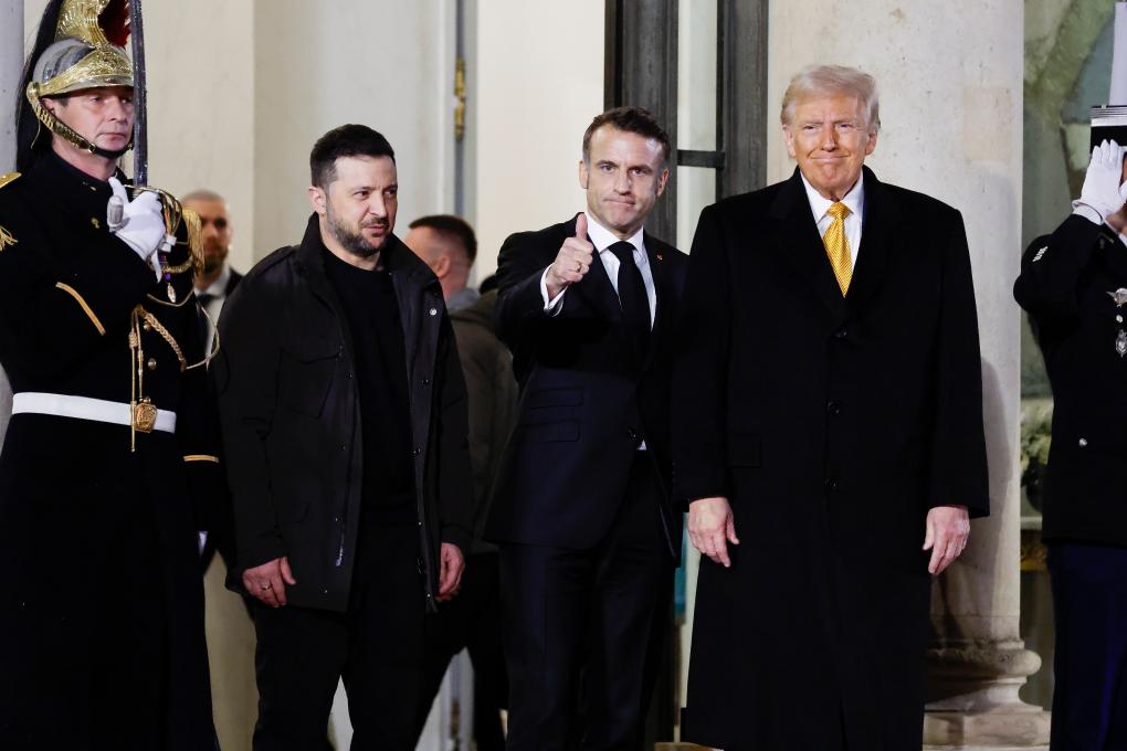 2024年12月7日,法國總統(tǒng)馬克龍(左三)與美國當(dāng)選總統(tǒng)特朗普(右)和烏克蘭總統(tǒng)澤連斯基(左二)會(huì)晤后走出愛麗舍宮。新華社發(fā)(亨利·施瓦茨攝)