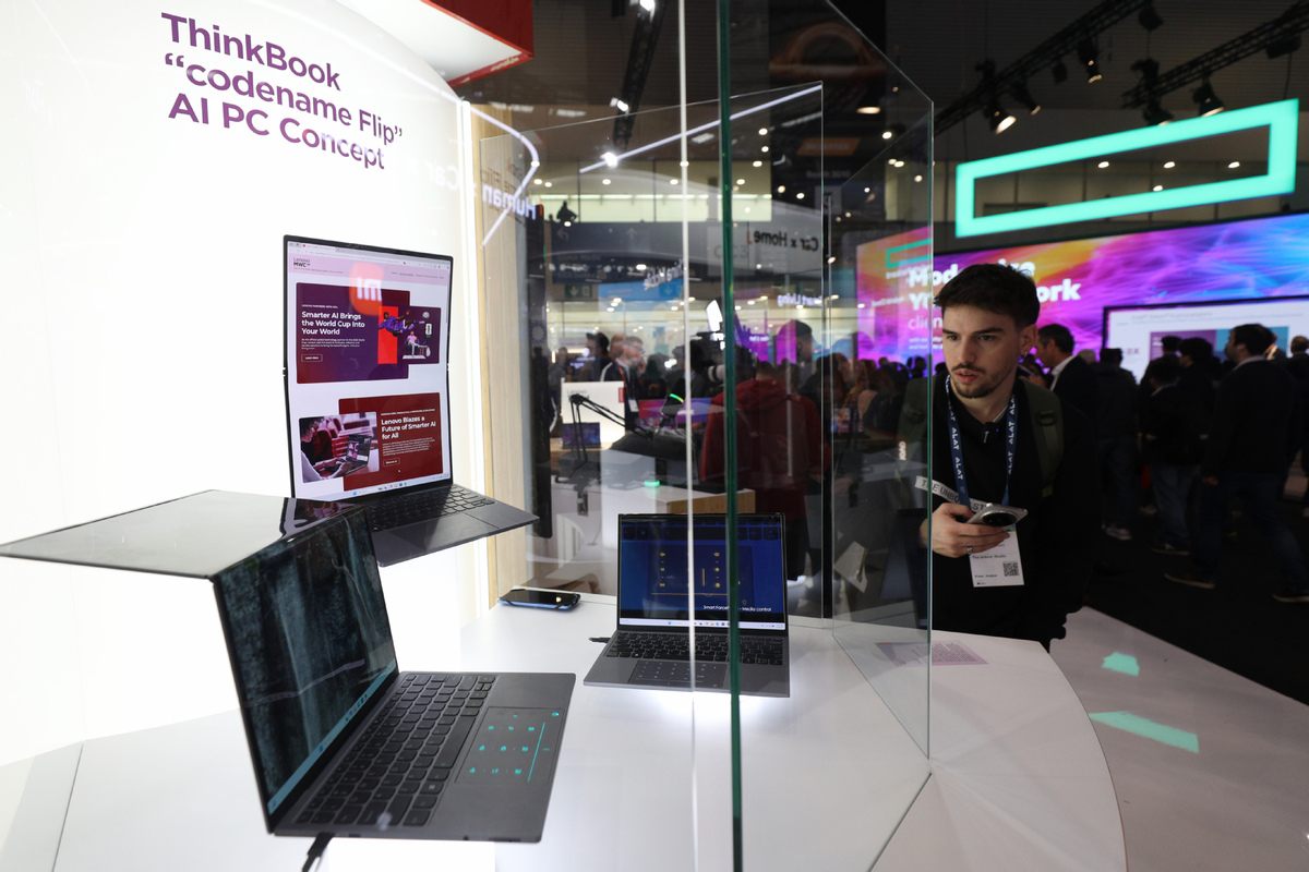 3月3日,在西班牙巴塞羅那舉行的2025年世界移動(dòng)通信大會(huì)上,一名男子在聯(lián)想展區(qū)參觀外折屏筆記本電腦ThinkBook Flip AI PC概念機(jī)。(圖片來源:新華社)