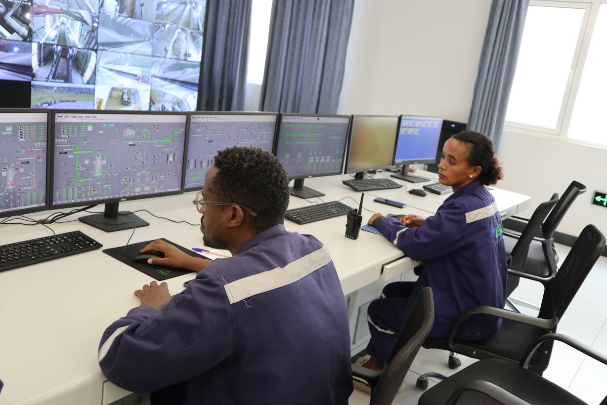3月5日,當(dāng)?shù)貑T工在埃塞俄比亞萊米國家水泥廠的中控室工作。(圖片來源:新華社)