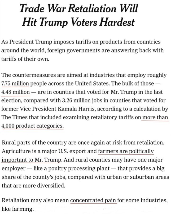 《紐約時(shí)報(bào)》對美國遭受反制關(guān)稅打擊的4000多個(gè)產(chǎn)品類別進(jìn)行的分析顯示,各行業(yè)共有約775萬人受到波及,其中約有448萬人來自大選中支持特朗普的地區(qū),主要集中在以農(nóng)業(yè)為主要產(chǎn)業(yè)的美國中西部、南部和東南部。