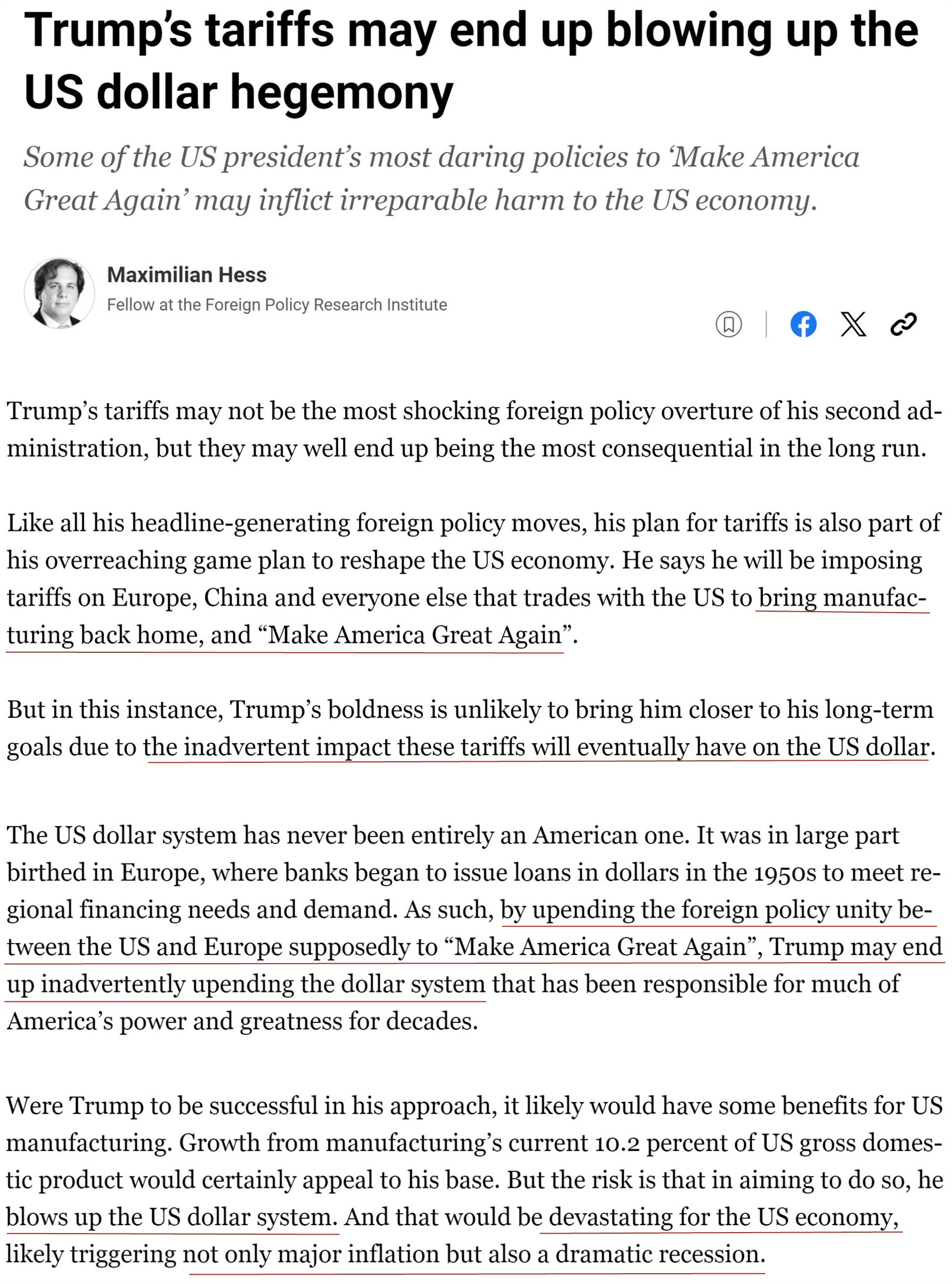文章指出,一直以來,全球?qū)γ涝男枨笫蛊涑蔀槊绹闹饕隹诋a(chǎn)品。正是這種“過分的特權(quán)”使美國能夠在不對經(jīng)濟(jì)造成重大負(fù)擔(dān)的情況下長期維持貿(mào)易和財(cái)政赤字。而如今特朗普政府的關(guān)稅政策可能最終摧毀美元霸權(quán),從而使美國經(jīng)濟(jì)遭到毀滅性打擊。