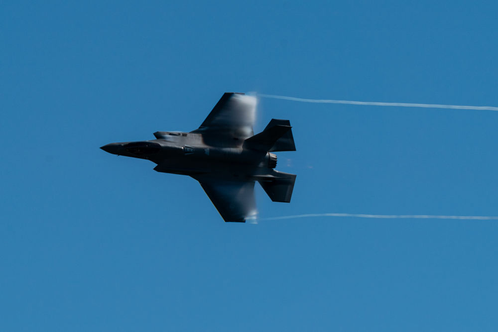 2023年10月14日,在美國休斯敦航展上,F(xiàn)-35閃電飛行表演隊的一架飛機(jī)進(jìn)行表演。新華社發(fā)(陳晨攝)