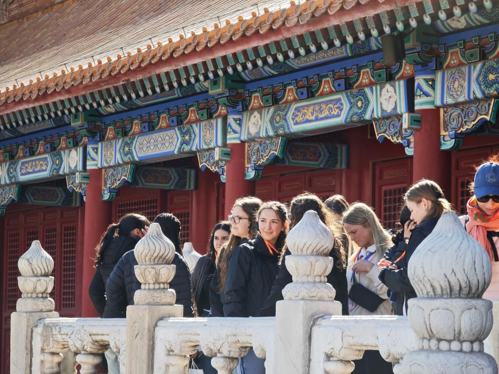 3月18日,美國(guó)艾奧瓦州高中生研學(xué)團(tuán)游覽北京故宮。新華社記者 馬卓言 攝