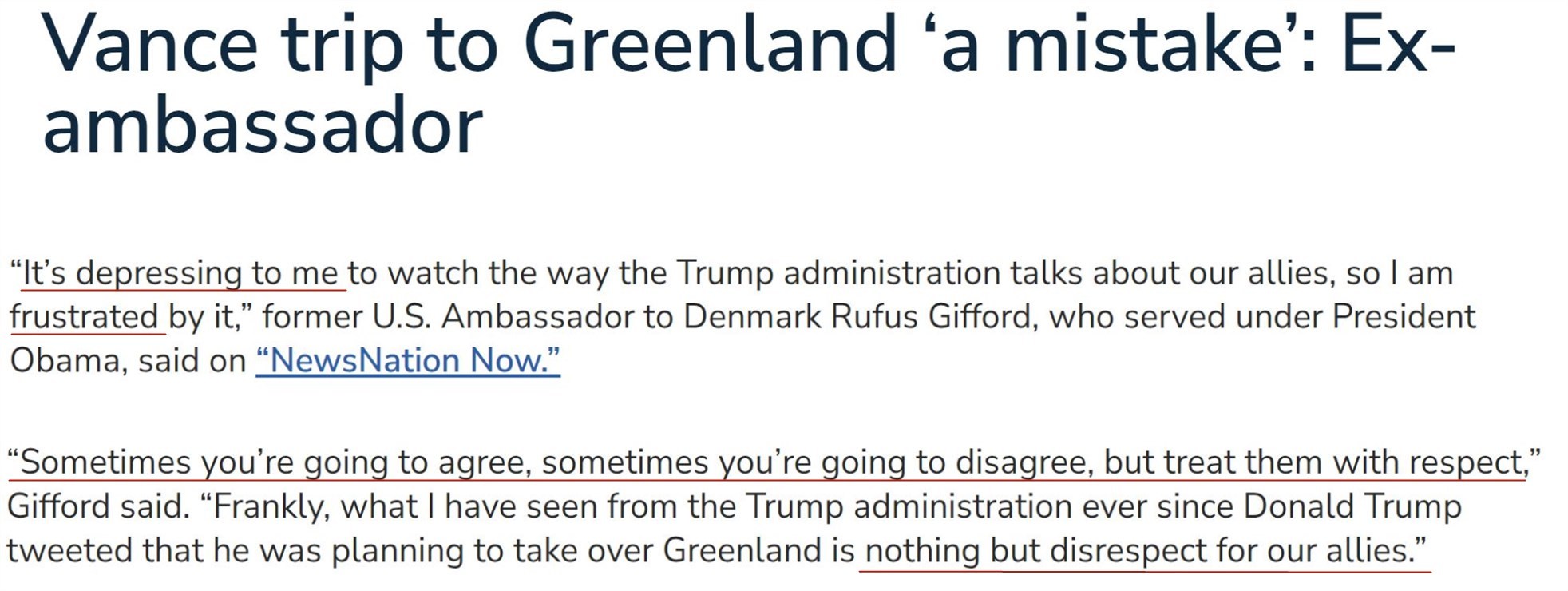 美國(guó)前駐丹麥大使吉福德近日在接受采訪時(shí)也認(rèn)為,美國(guó)政府在格陵蘭島問(wèn)題上缺乏最起碼的尊重。