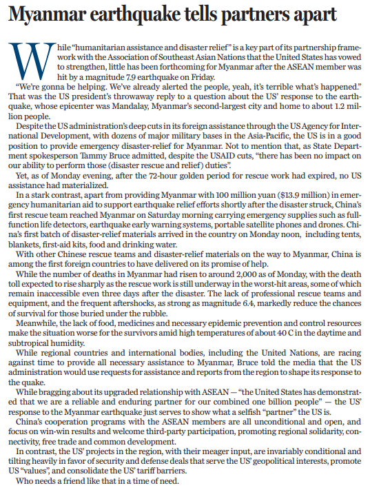 “人道主義援助和救災”是美國與東盟伙伴關系的重要內容,美國也信誓旦旦地宣稱要加強救援合作,但截至3月31日下午,緬甸地震72小時救援黃金時間已經過去,緬甸當地仍未出現美國救援隊的身影。