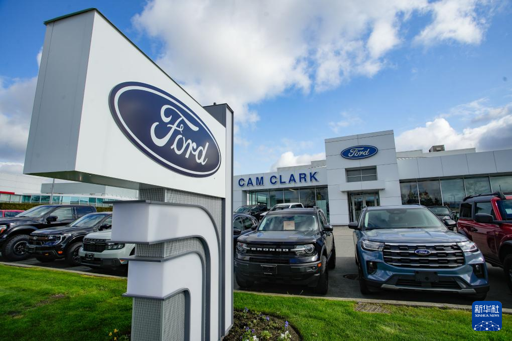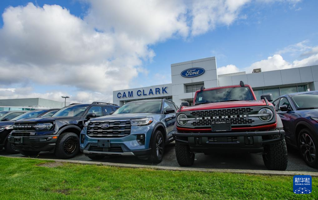 4月3日,車輛陳列在加拿大溫哥華一家福特汽車經(jīng)銷商店面外。新華社發(fā)(梁森攝)