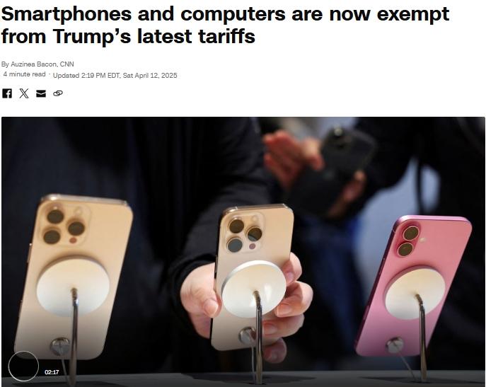 美國海關(guān)與邊境保護(hù)局發(fā)布的文件顯示,這些產(chǎn)品被排除在政府對貿(mào)易伙伴實施的所謂“對等關(guān)稅”之外?;砻獾漠a(chǎn)品適用于4月5日以后進(jìn)入美國的電子產(chǎn)品,已經(jīng)支付的“對等關(guān)稅”可以尋求退款。