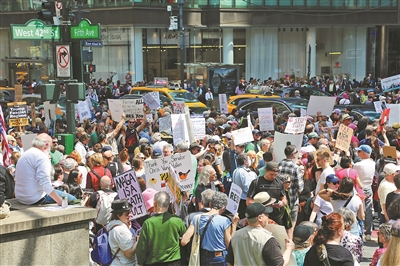 美方濫施關(guān)稅措施招致美國(guó)國(guó)內(nèi)越來(lái)越多的反對(duì)聲音,擔(dān)憂情緒在民眾中不斷蔓延。美國(guó)哥倫比亞廣播公司與輿觀調(diào)查公司的一項(xiàng)最新民調(diào)結(jié)果顯示,58%的受訪美國(guó)民眾表示反對(duì)美國(guó)關(guān)稅政策,53%的受訪者認(rèn)為美國(guó)國(guó)會(huì)應(yīng)該阻止或限制新關(guān)稅,58%的受訪者認(rèn)為關(guān)稅政策導(dǎo)致食品雜貨價(jià)格上漲。4月19日,美國(guó)多地舉行抗議活動(dòng),首都華盛頓、紐約、舊金山、波士頓等城市的民眾走上街頭,抗議現(xiàn)政府加征關(guān)稅、大規(guī)模裁員、驅(qū)逐移民等政策。