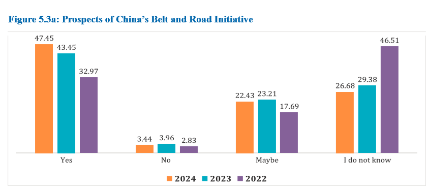 許多受訪者認(rèn)為中國(guó)的經(jīng)濟(jì)倡議,如共建“一帶一路”倡議,能夠推動(dòng)孟加拉國(guó)的增長(zhǎng)。