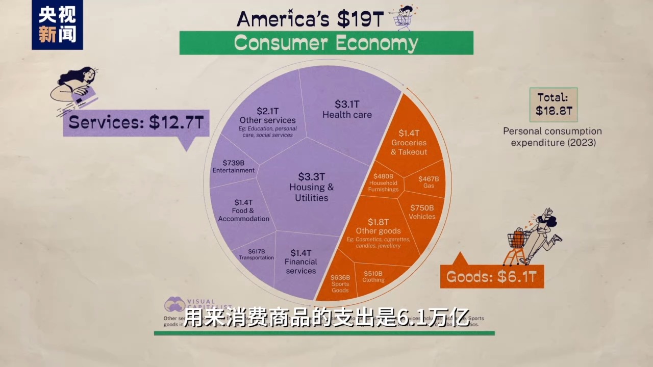 按美國勞動局數(shù)據(jù),美國人2023年消費支出18.8萬億美元,其中12.7萬億花在了看病、租房、交學費、打官司等服務上,用來消費商品的支出是6.1萬億,不到總消費的三分之一。所以吹噓美國消費能力強屬實是個“地獄笑話”,看病花錢多有什么可驕傲的?