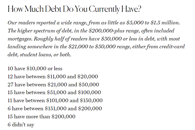 該網(wǎng)站針對102名讀者就個人債務問題進行了調(diào)查,了解他們?nèi)绾伪池摵蛢斶€債務。調(diào)查發(fā)現(xiàn),個人債務總額從5000美元到150萬美元不等,20萬美元以上的債務通常包含抵押貸款。約半數(shù)受訪者的債務在5萬美元及以下,最常見的債務范圍在2.1萬美元至5萬美元之間。