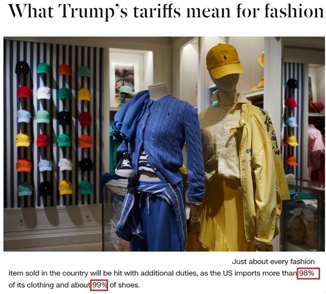 美國有線電視新聞網(wǎng)近日刊發(fā)文章指出,關稅政策對服裝行業(yè)的影響尤為嚴重,因為美國人衣櫥里98%的衣物和99%的鞋子都是進口的。