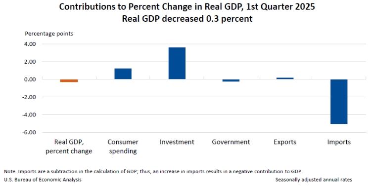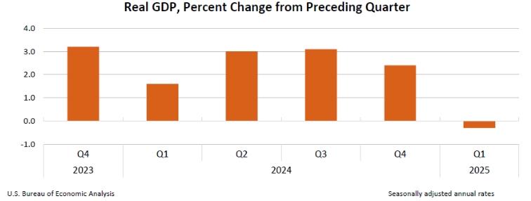 4月30日,美國商務(wù)部公布了2025年美國一季度經(jīng)濟數(shù)據(jù),美國一季度國內(nèi)生產(chǎn)總值環(huán)比(按年率計算)萎縮0.3%,為三年來首次負增長。
