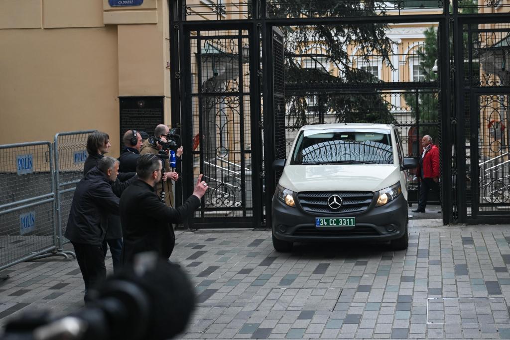 4月10日,在土耳其伊斯坦布爾,載有美國代表的車輛駛離俄羅斯駐伊斯坦布爾總領(lǐng)館。新華社記者劉磊攝