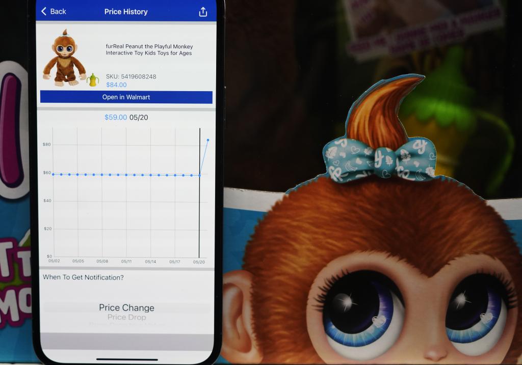 5月21日,在美國舊金山灣區(qū)圣利安卓San Leandro的一家沃爾瑪超市,價(jià)格跟蹤軟件(Walmart Tracker)顯示商品(中國產(chǎn)毛猴玩具)售價(jià)變化。新華社記者吳曉凌攝