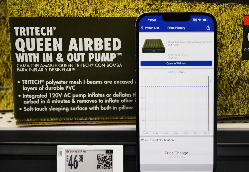 5月21日,在美國加利福尼亞州舊金山灣區(qū)圣萊安德羅的一家沃爾瑪超市,價(jià)格跟蹤軟件顯示一款中國產(chǎn)充氣床墊售價(jià)變化情況。新華社記者 吳曉凌 攝