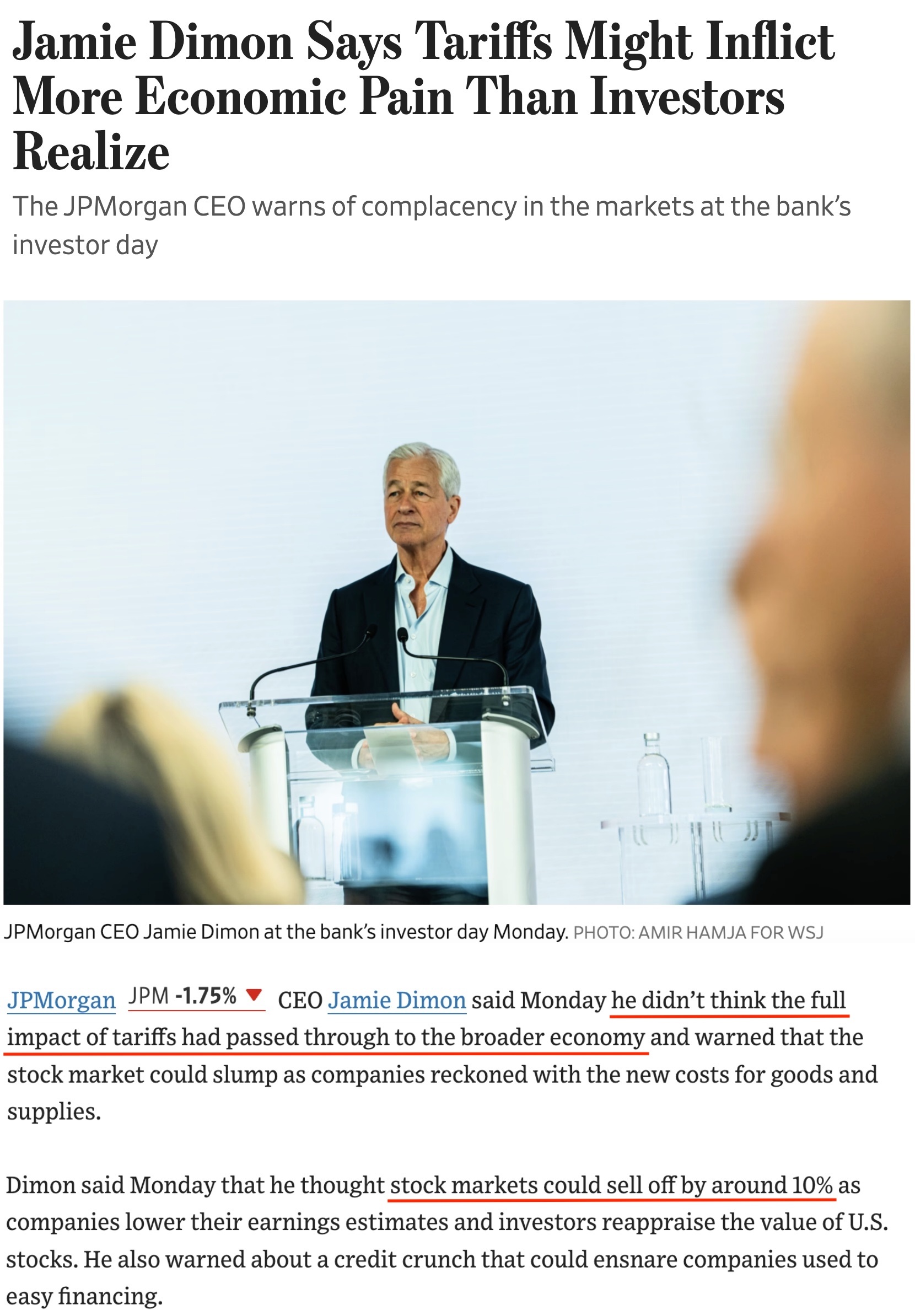 摩根大通公司首席執(zhí)行官杰米·戴蒙近日指出,關(guān)稅的全部影響尚未傳導(dǎo)至整體經(jīng)濟(jì),通脹加劇和滯脹的可能性比人們認(rèn)為的要大,隨著企業(yè)下調(diào)利潤預(yù)期以及投資者重新評(píng)估美國股票的價(jià)值,股市可能下跌約10%。