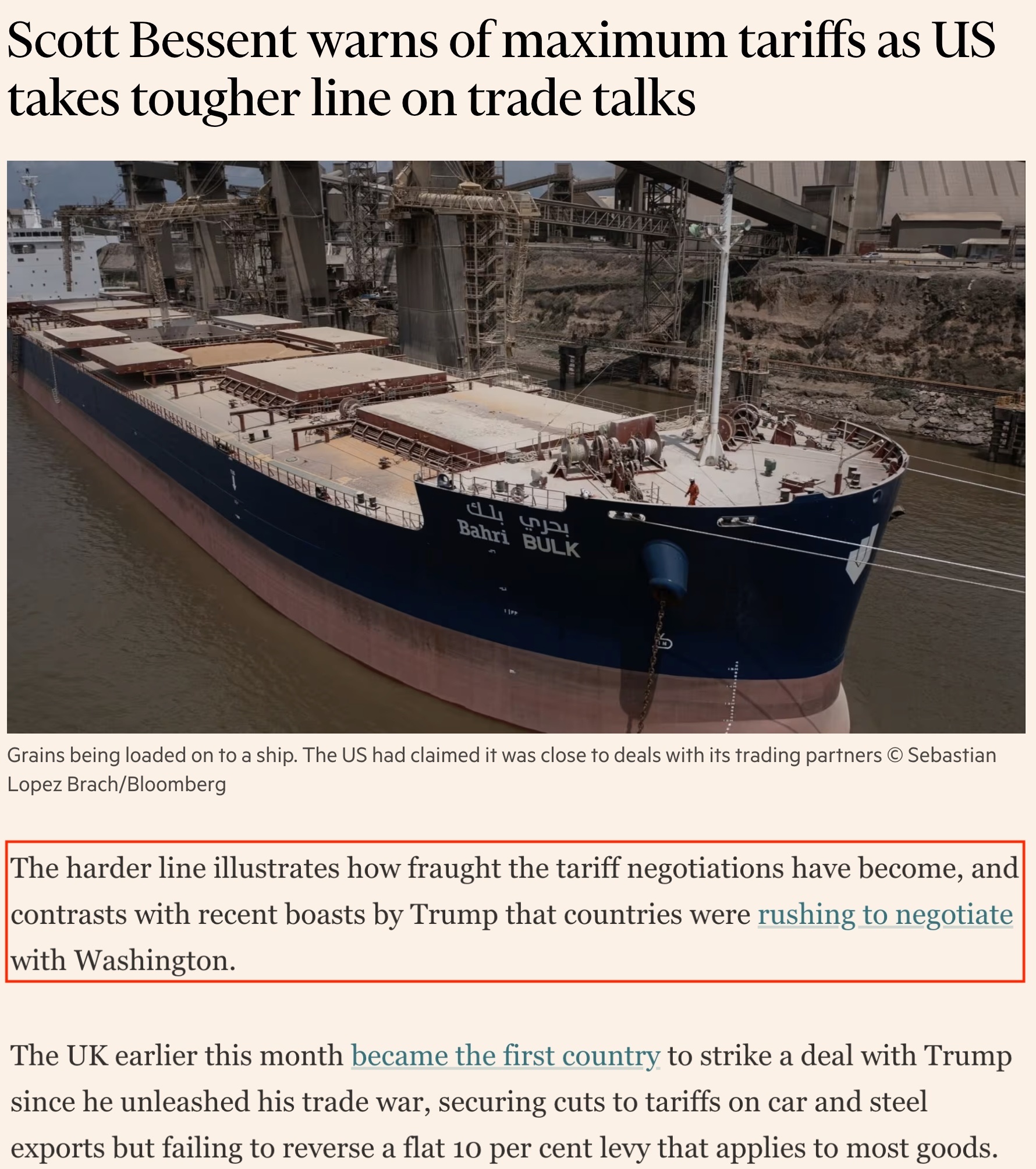 英國《金融時(shí)報(bào)》稱,這表明關(guān)稅談判已經(jīng)變得十分令人擔(dān)憂,與美國總統(tǒng)最近吹噓各國正急于與美國談判形成了鮮明對比。