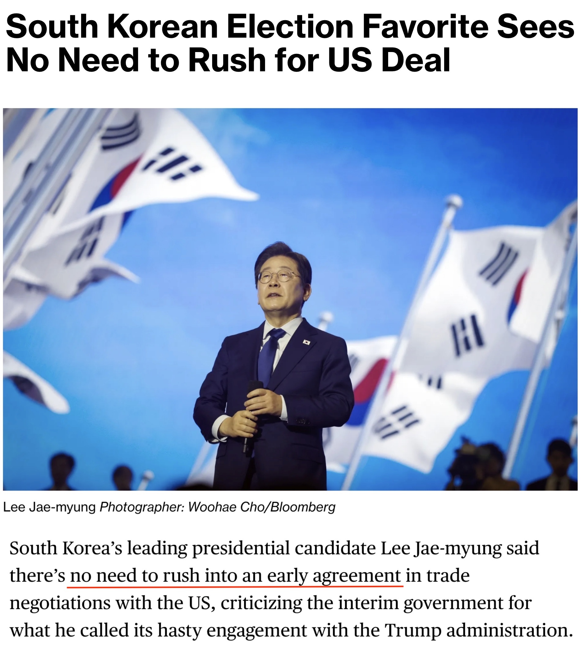 彭博社指出,盡管官員們不愿公開表示他們的態(tài)度變得強(qiáng)硬,但有跡象表明,一些國家已經(jīng)意識(shí)到手中的牌比之前認(rèn)為的多,因此可以放慢談判的步伐。比如目前韓國民調(diào)領(lǐng)先的總統(tǒng)候選人李在明就表示,沒必要急于與美國達(dá)成貿(mào)易協(xié)議。