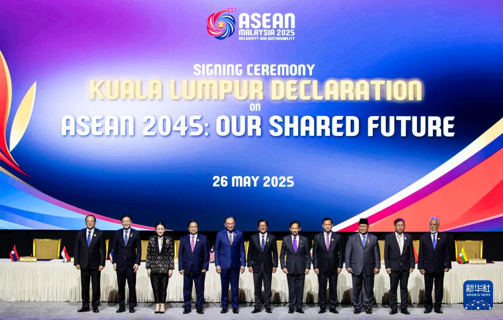 5月26日,在馬來西亞首都吉隆坡,老撾總理宋賽、新加坡總理黃循財(cái)、泰國(guó)總理佩通坦、越南總理范明政、馬來西亞總理安瓦爾、菲律賓總統(tǒng)馬科斯、文萊蘇丹哈桑納爾、柬埔寨首相洪瑪奈、印度尼西亞總統(tǒng)普拉博沃、緬甸外交部常秘昂覺莫(前排從左至右)出席第46屆東盟峰會(huì)“吉隆坡宣言”簽署儀式。新華社記者 馬平 攝