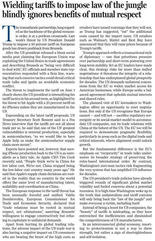 上周,美國(guó)總統(tǒng)特朗普威脅稱,自6月1日起將對(duì)歐盟商品征收50%的關(guān)稅。他在社交媒體平臺(tái)發(fā)文,直言不諱地指責(zé)歐盟長(zhǎng)期通過貿(mào)易協(xié)定榨取美國(guó),并稱與歐委會(huì)“極難打交道”。歐盟官員隨即強(qiáng)硬回應(yīng),警告稱,此類威脅可能導(dǎo)致至關(guān)重要的貿(mào)易談判破裂,引發(fā)一場(chǎng)本不必要的經(jīng)濟(jì)沖突。
