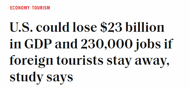 經(jīng)濟分析公司Implan首席經(jīng)濟學家珍妮弗·索瓦爾德森(Jennifer Thorvaldson)測算稱,基于3月份外國游客赴美人數(shù)下降的情況,若今年國際游客減少10%,不僅美國國內(nèi)生產(chǎn)總值(GDP)將損失230億美元,還會損失大約23萬個工作崗位。