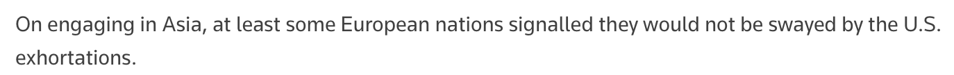 文章注意到歐盟外交與安全政策高級代表卡婭·卡拉斯的發(fā)言,稱她似乎將歐盟定位為亞洲富有成效的合作伙伴。她認(rèn)為,亞洲或許可以成為一種新選擇,以應(yīng)對美國如今的日益反復(fù)無常、奉行保護(hù)主義,以及不再重視基于規(guī)則的國際秩序。