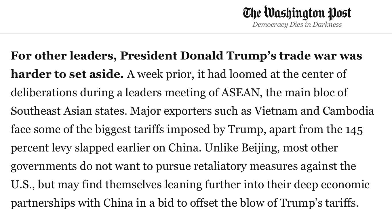 文章說,盡管大多數(shù)亞洲國家的政府沒有對美國采取反制措施,但它們都更傾向于進(jìn)一步鞏固與中國的深厚經(jīng)濟(jì)伙伴關(guān)系,以抵消美國關(guān)稅帶來的沖擊。