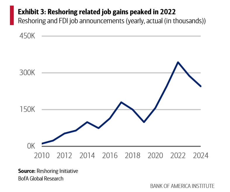 報(bào)告顯示,美國(guó)制造業(yè)回流創(chuàng)造的就業(yè)機(jī)會(huì)在2022年達(dá)到高峰后開(kāi)始減少。