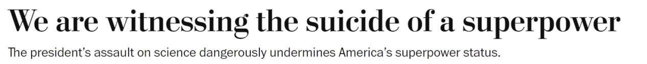 《華盛頓郵報(bào)》也刊文警告,美國(guó)現(xiàn)政府一直宣稱(chēng)要讓美國(guó)“再次偉大”,但如今它卻正在對(duì)美國(guó)實(shí)力的真正來(lái)源——包括對(duì)科學(xué)研究的長(zhǎng)期投資——造成嚴(yán)重的且可能無(wú)法彌補(bǔ)的損害。