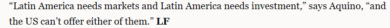 文章指出,并非所有人都對(duì)拉美與中國(guó)之間的合作感到滿意。華盛頓尤其擔(dān)心。不過(guò),許多人認(rèn)為華盛頓影響拉丁美洲的能力有限。文章援引利馬國(guó)立圣馬科斯大學(xué)的亞洲經(jīng)濟(jì)專家卡洛斯·阿基諾的話指出,“拉丁美洲需要市場(chǎng)和投資,但美國(guó)無(wú)法提供其中任何一項(xiàng)”。