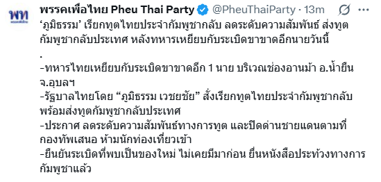 泰國執(zhí)政黨為泰黨23日發(fā)布聲明表示,一名泰國士兵當天在泰柬邊境觸發(fā)地雷而受傷,泰方因而決定降低雙方的外交關系等級。按照泰國外交部的說法,致泰國士兵受傷的地雷系柬方新布設,泰方已就此向柬方提出正式抗議。