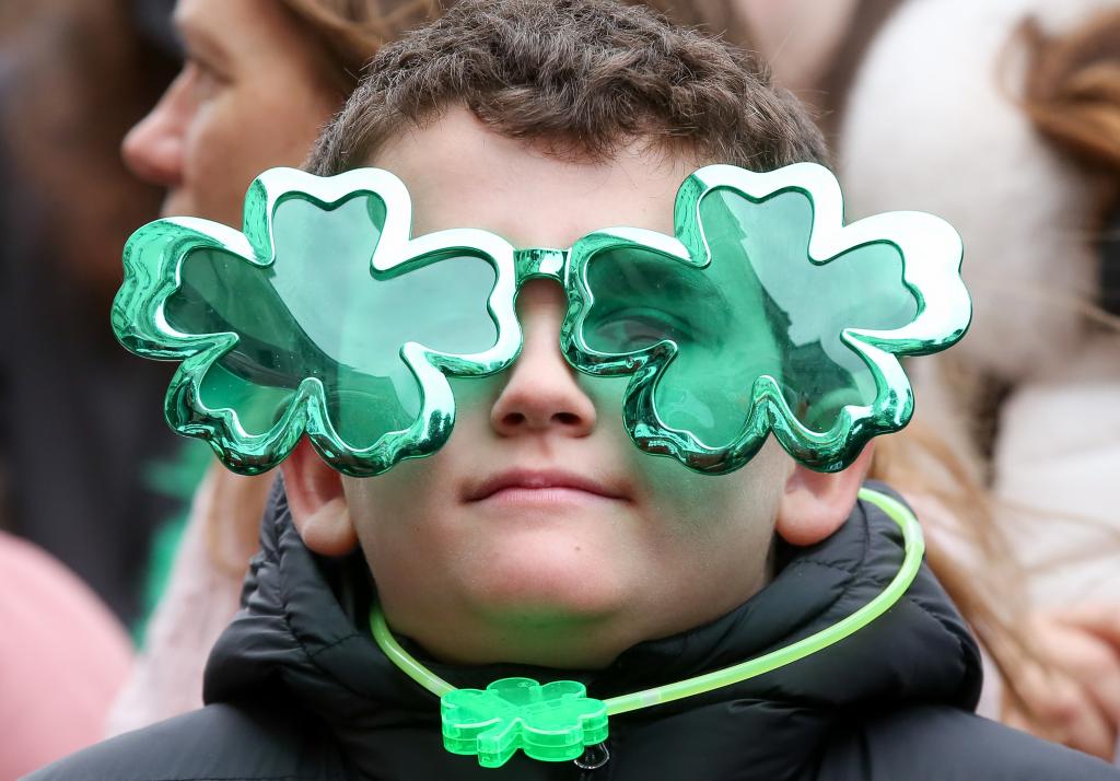 2024年3月17日,一名兒童在英國倫敦參加圣帕特里克節(jié)游行。新華社發(fā)